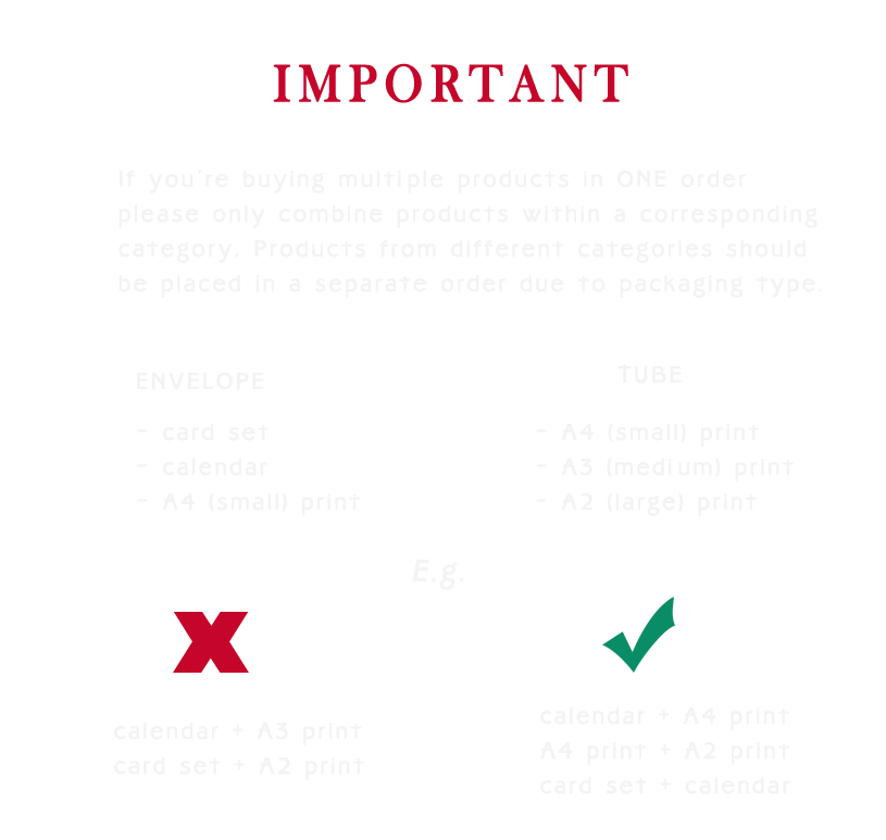 - if you're ordering prints in the same order as a calendar make sure they're A4 (small) size. A3 and A2 (medium and large) prints must be placed in a separate order. This requirement is necessary due to the packaging type (calendars and A4 are shipped flat. A3 and A2 are shipped in a tube).